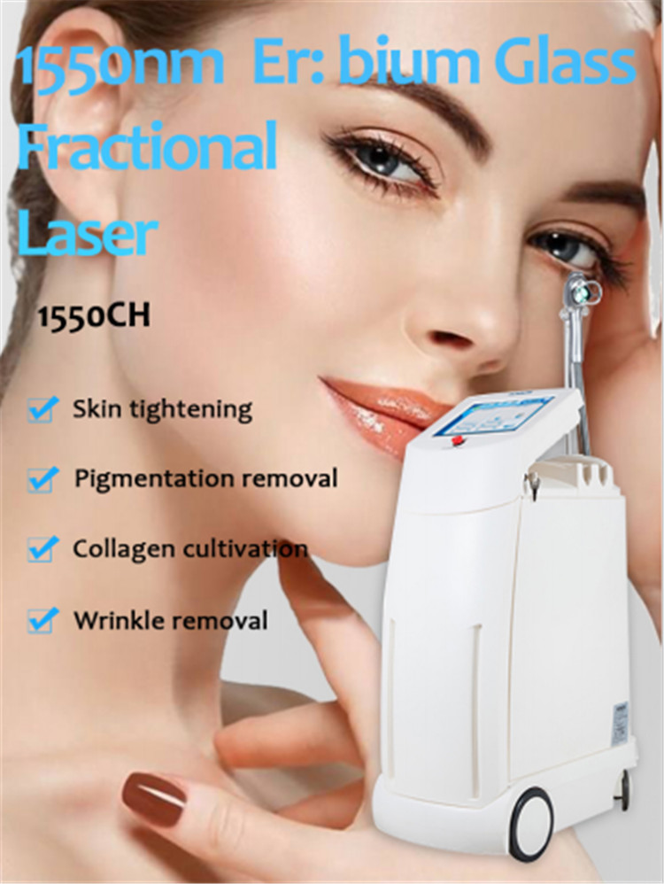 The Er:bium glass fractionallaser adopts fiber laser with 1550nm wavelength and installs a CPG which is arranged in a matrix scanning output, emitting a 50um-80um spot through a high focusing lens. The target tissue is water in the dermis, foming matrix-like holes (O.12mm) around the focal spot penetration directly. The penetration depth of these small spots is about 2mm. At this point the normal tissues surrounding tiny holes generate heat bridges which starts the wound rehabilitation reaction and thermal effects between scarfskin and dermal tissues, then experiencing inflammation phase, proliferation phase, remodeling phase. Cosmetic lotion can be applied into the wound for rehabilitation one hour after the irritation.